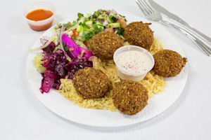 A salad base with five falafel balls hummus pita bread and tahini. Generous portions for the price and a good variety on the menu. 07082022 - MenuPix User.